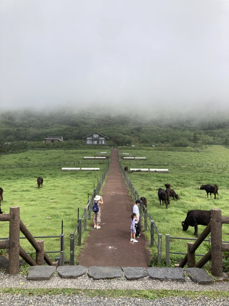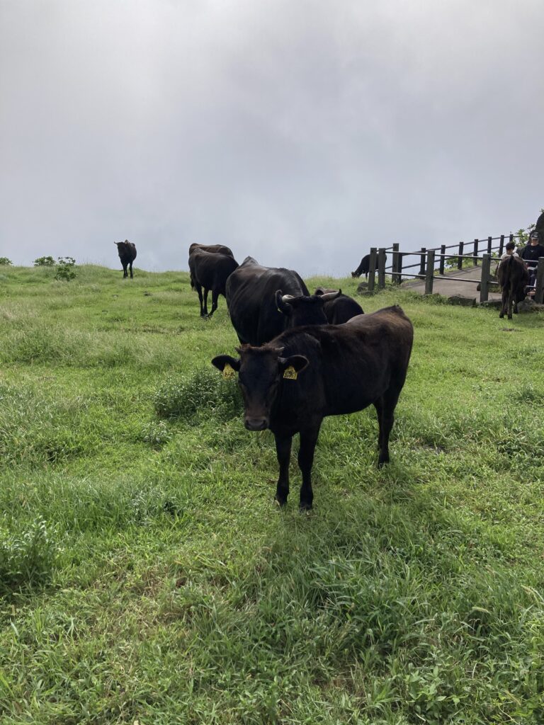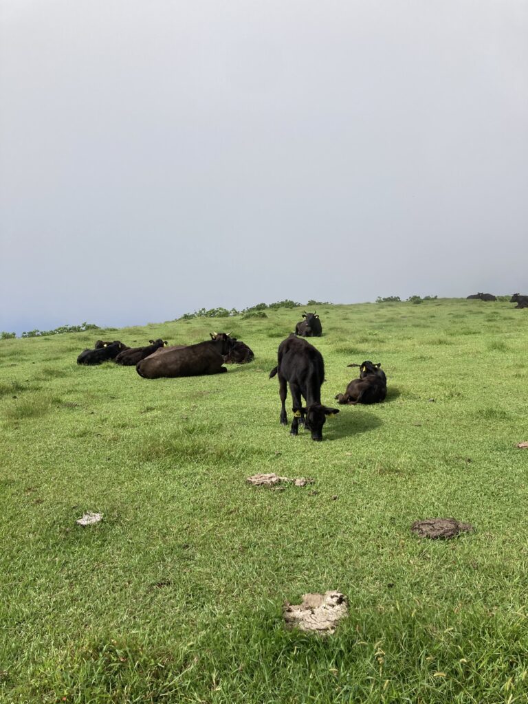 牛たちはのんびりと草を食んだり、寝転んだりしていて、平和な風景が広がっています。