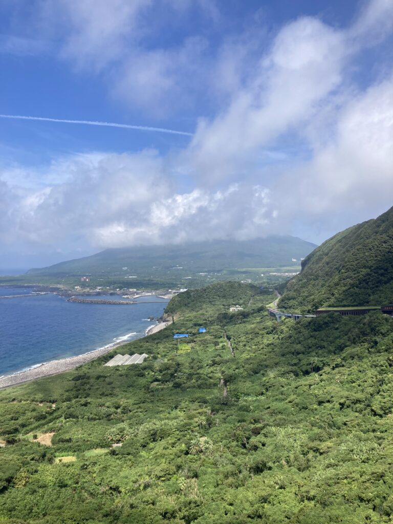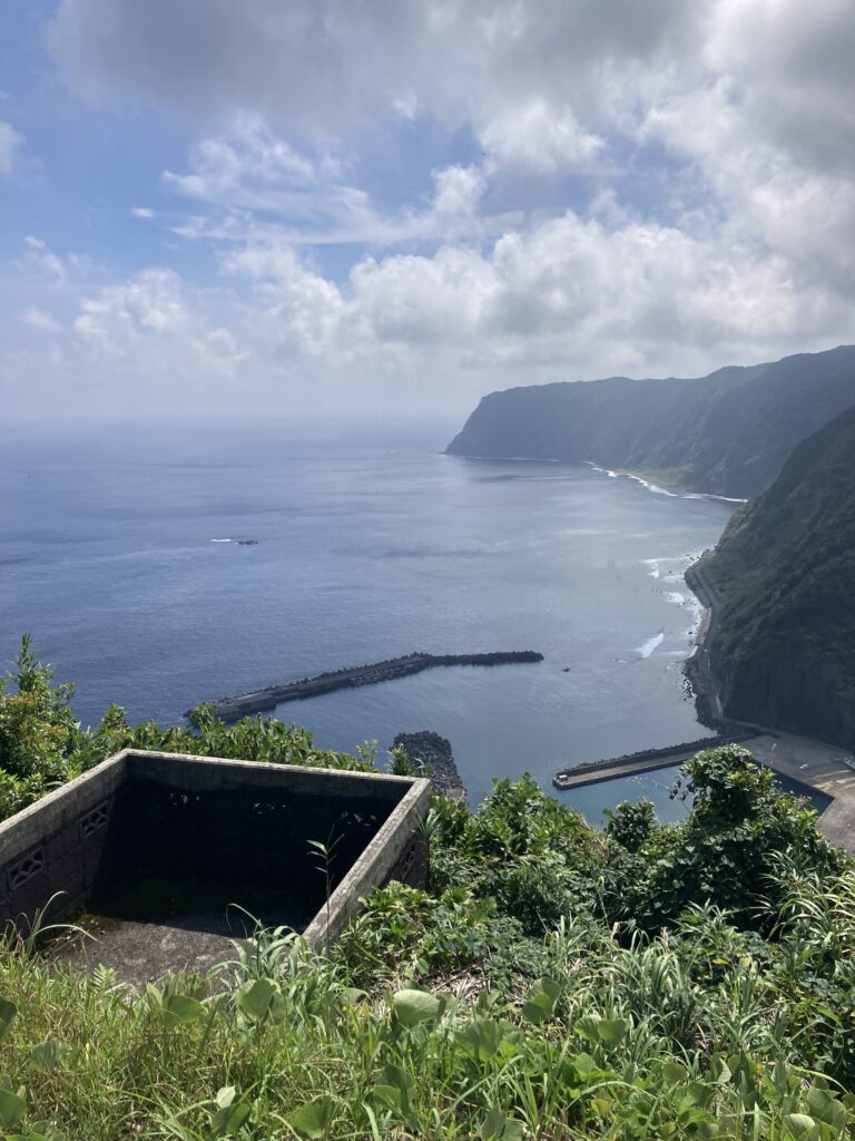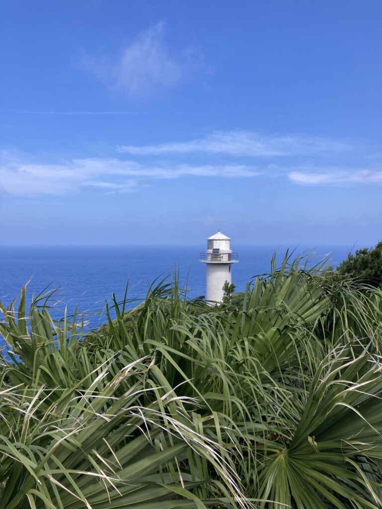 大越の灯台を見渡せる展望台へやってくると大海原の黒潮と八丈小島が美しく映えていました。