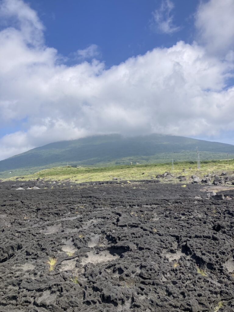 横間ヶ浦海岸で玉石垣を観察し、大坂の展望から八丈富士を望みました。飛行機ぐもがピューっと。