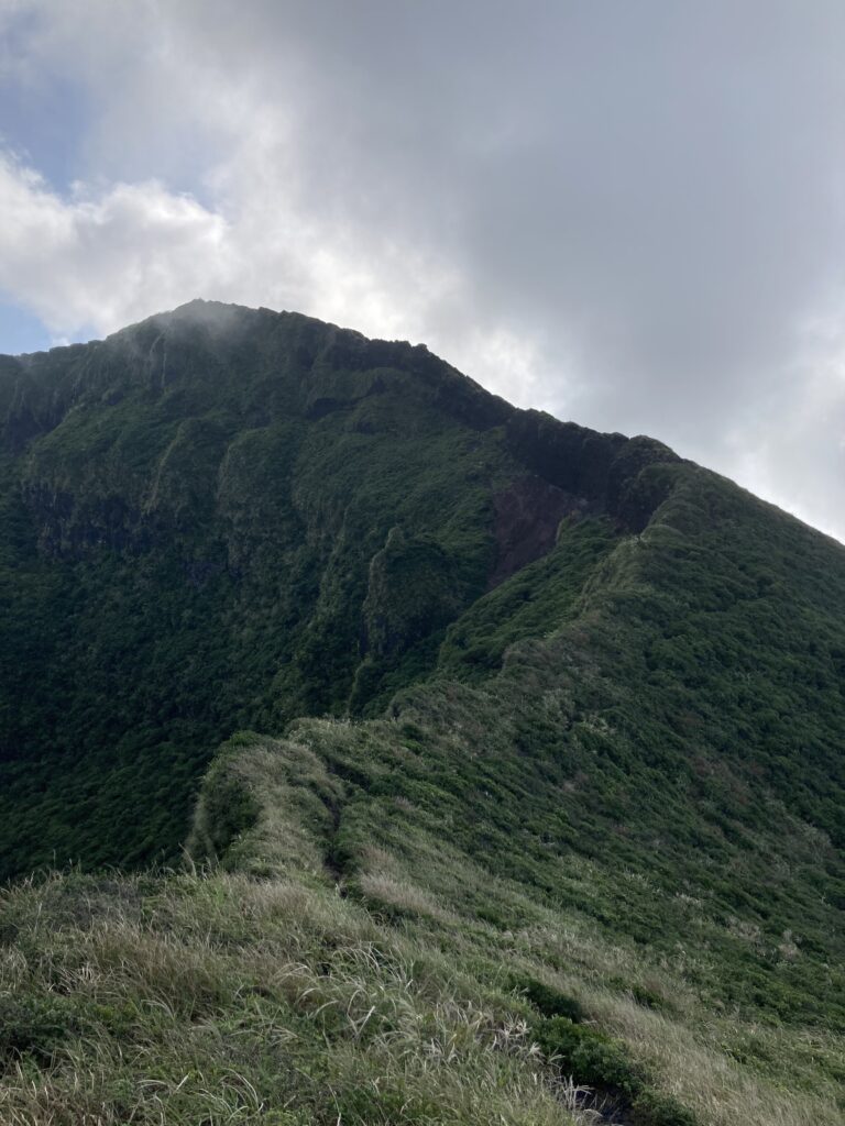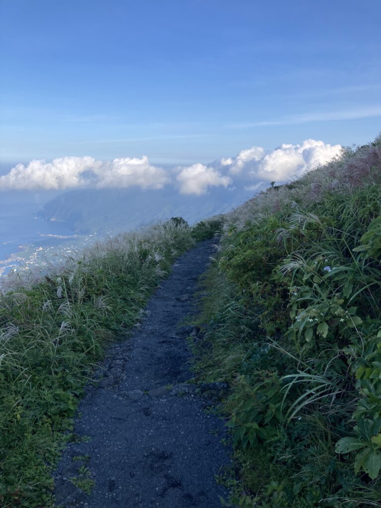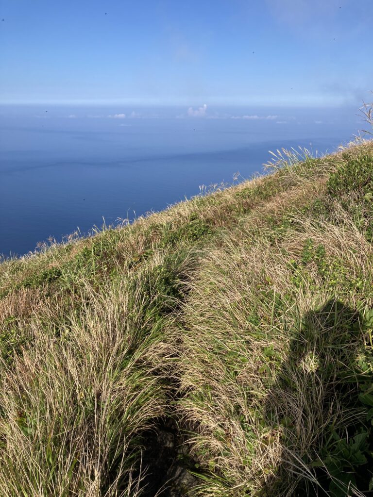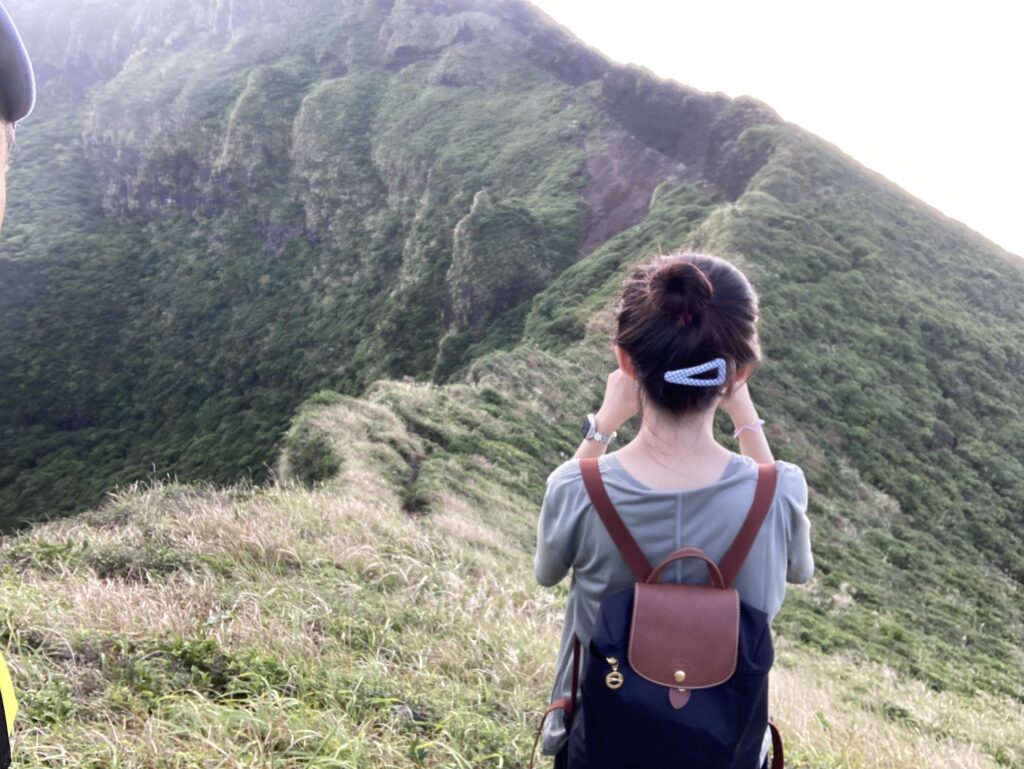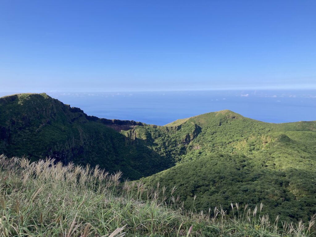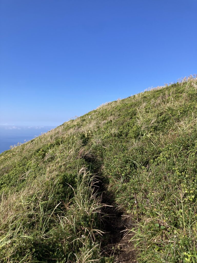 アマツバメが飛び交う稜線からは、絶景の八丈小島や小穴を望めます。稜線は美し過ぎて、自然に笑顔が溢れます。笑っちゃいます(笑)!