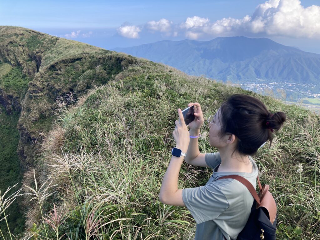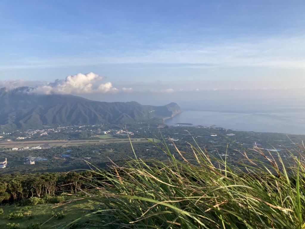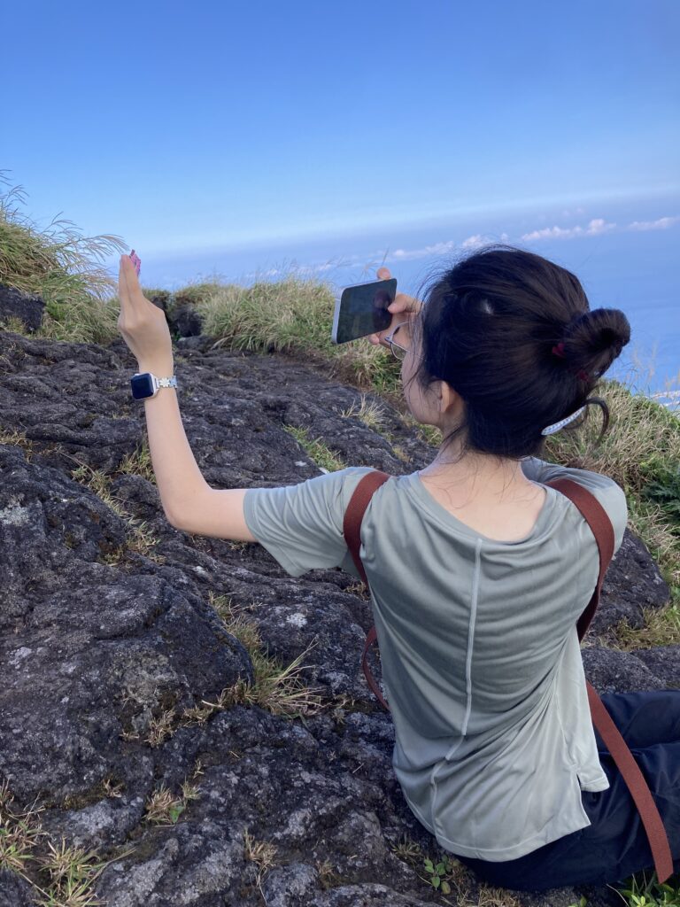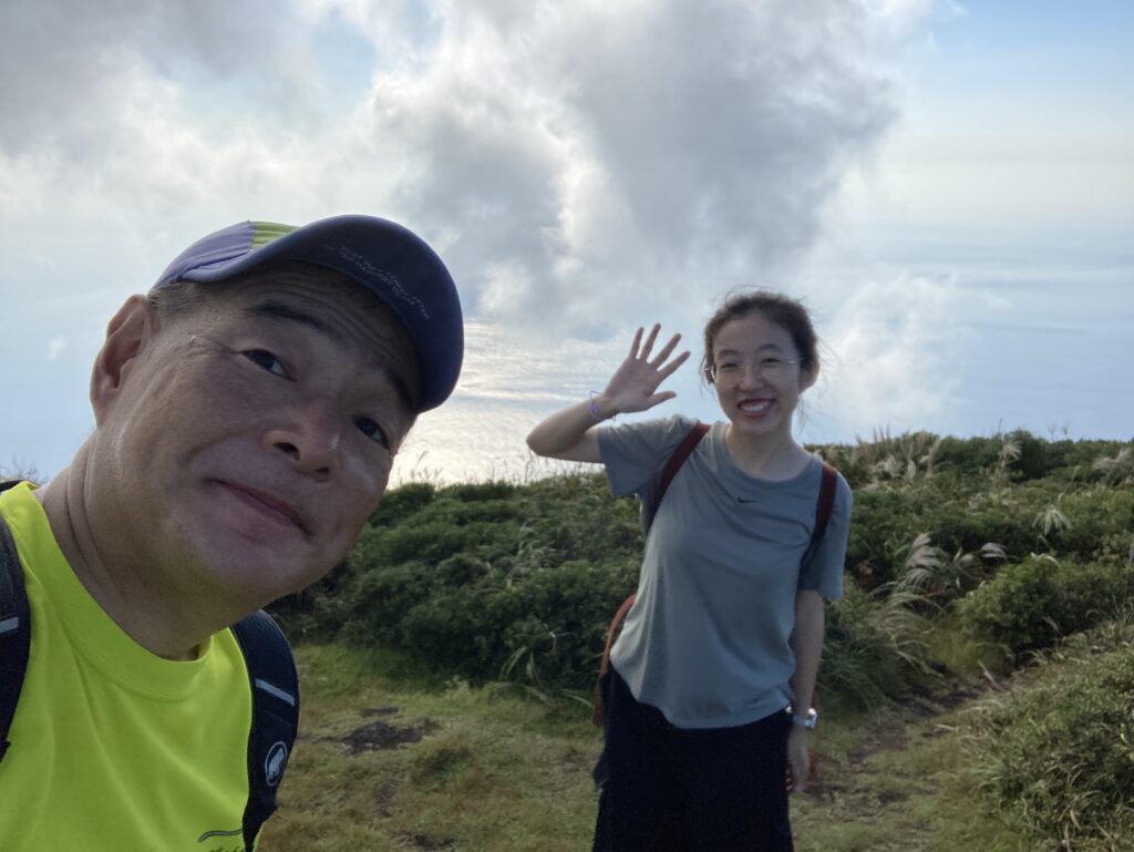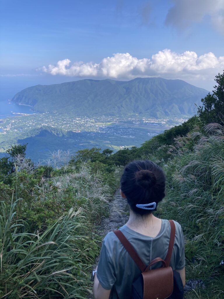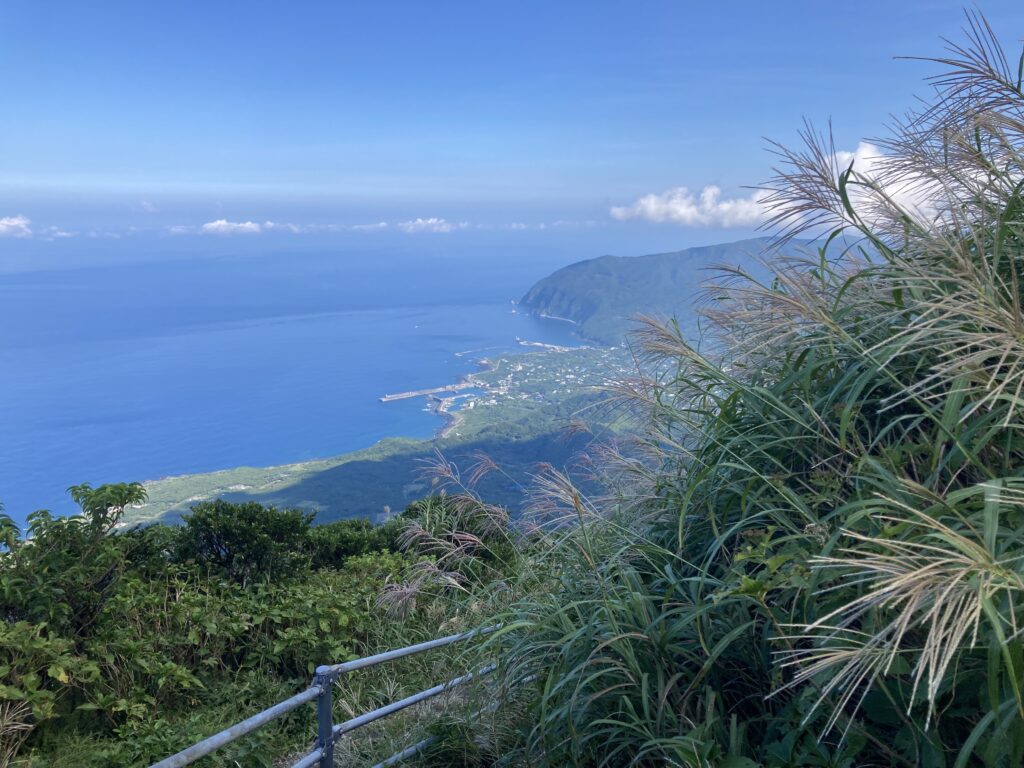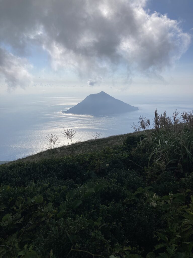 アマツバメが飛び交う稜線からは、絶景の八丈小島や小穴を望めます。稜線は美し過ぎて、自然に笑顔が溢れます。笑っちゃいます(笑)!