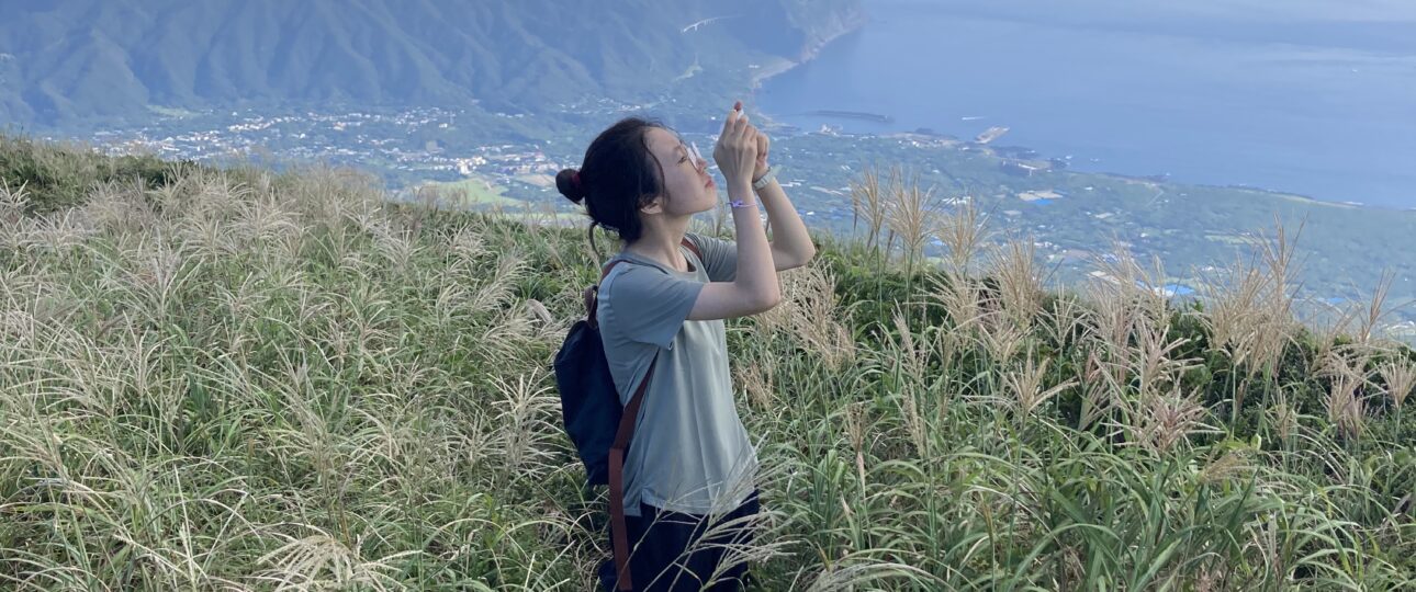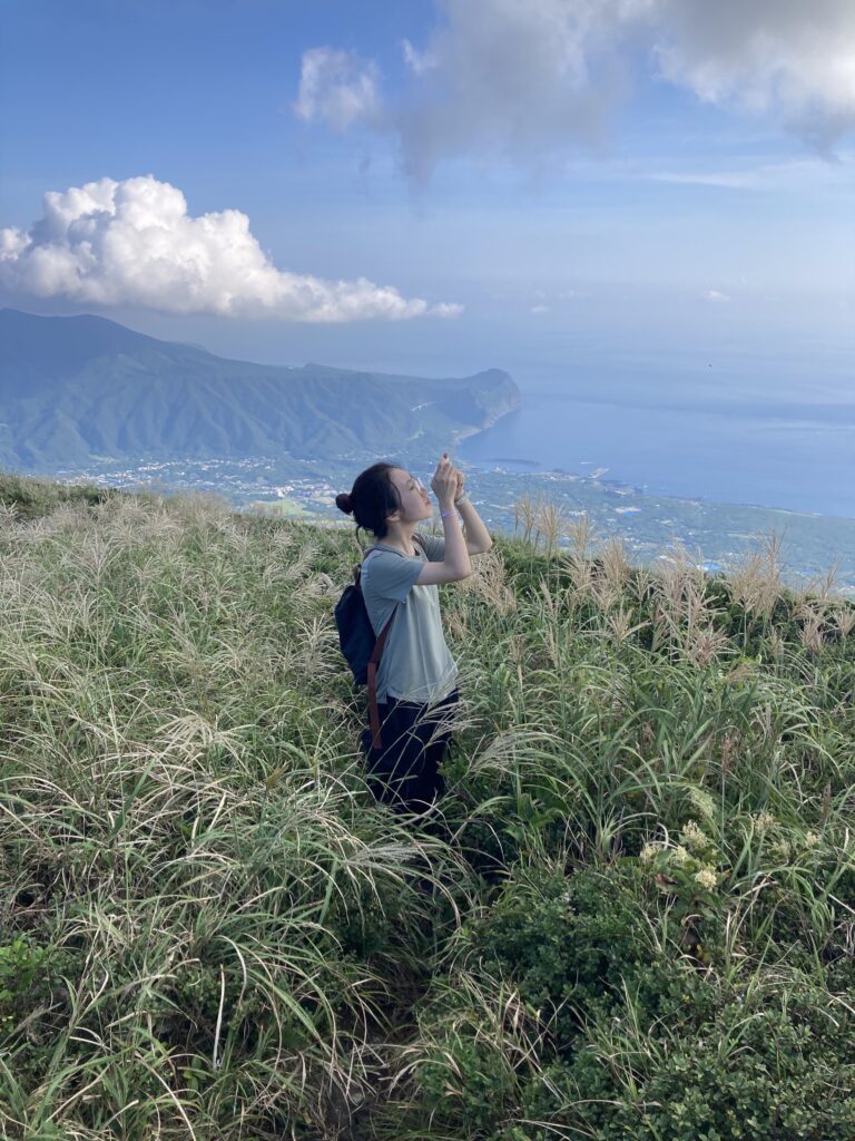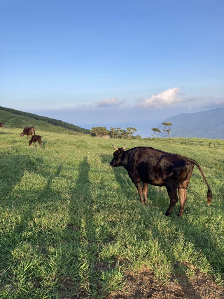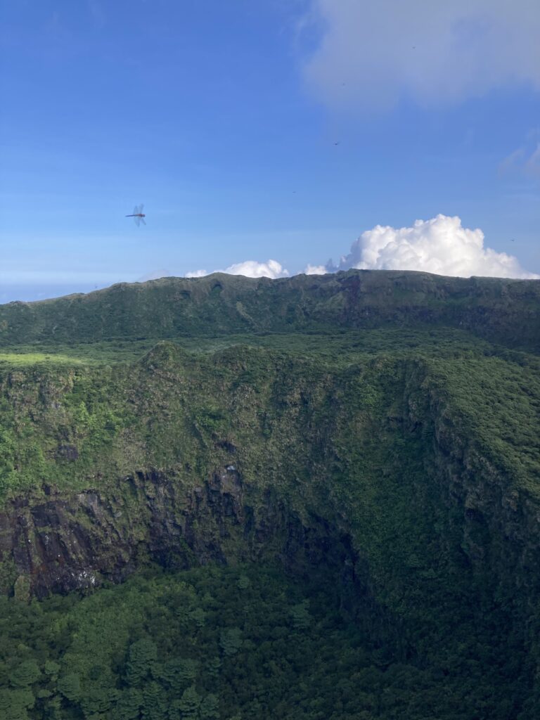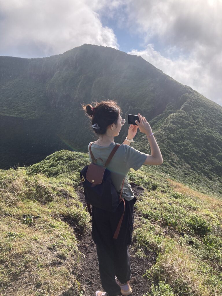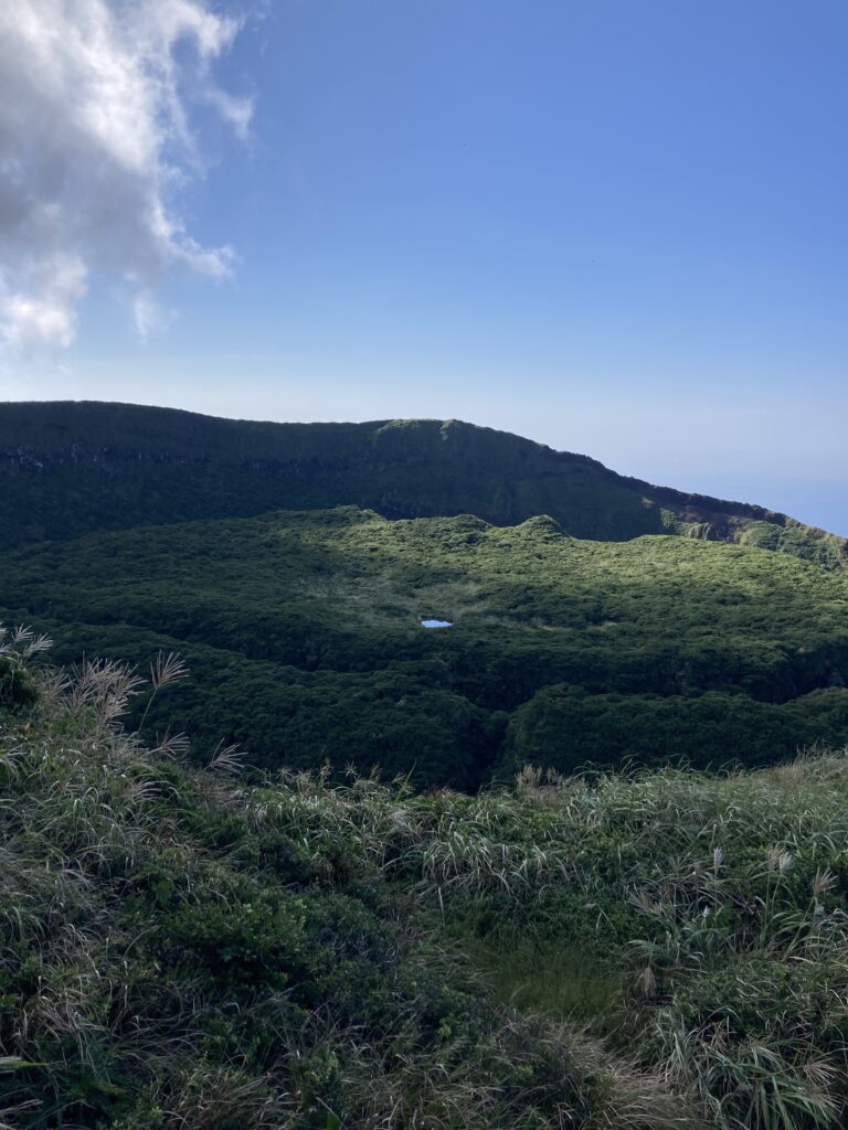 アマツバメが飛び交う稜線からは、絶景の八丈小島や小穴を望めます。稜線は美し過ぎて、自然に笑顔が溢れます。笑っちゃいます(笑)!