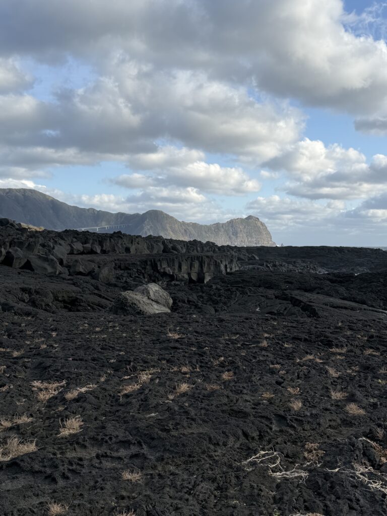 ランチ後は、南原千畳岩海岸を散策しました。1,605年に噴火した八丈富士の溶岩が流れた場所です。