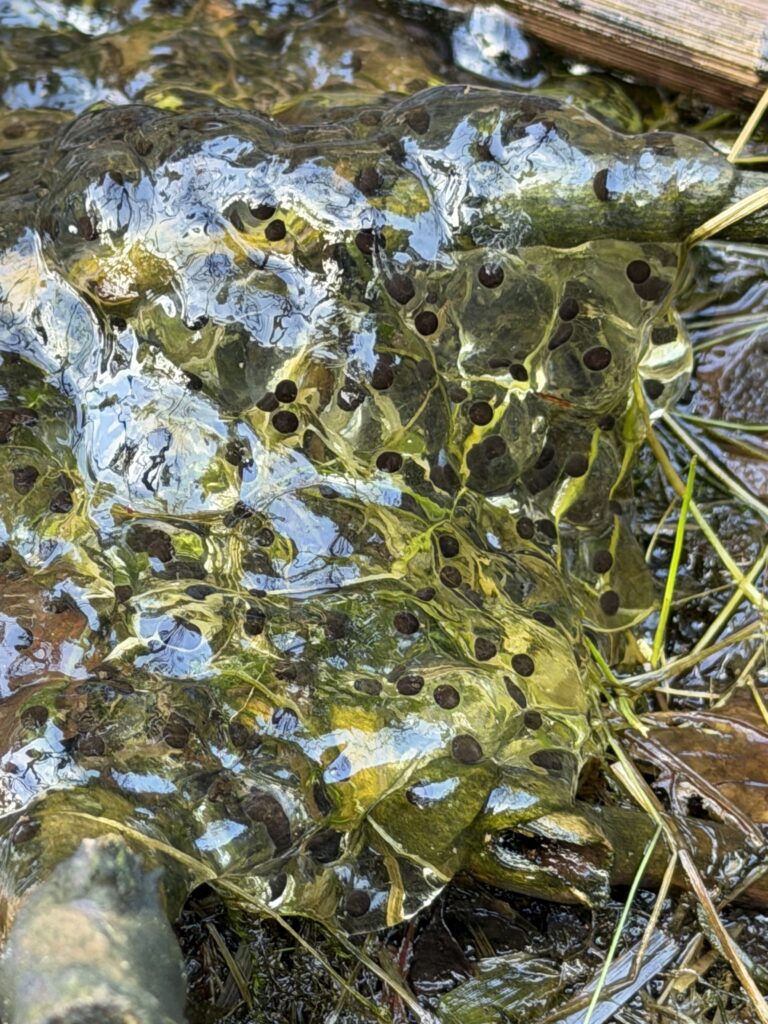 池塘のニホンアカガエルの卵は、池塘の水が少なくなっていて少し心配です。雨が降りますように。
