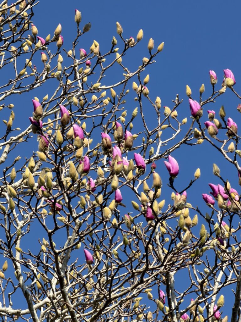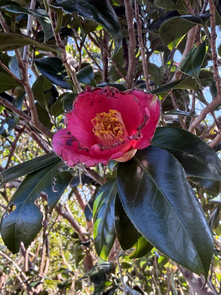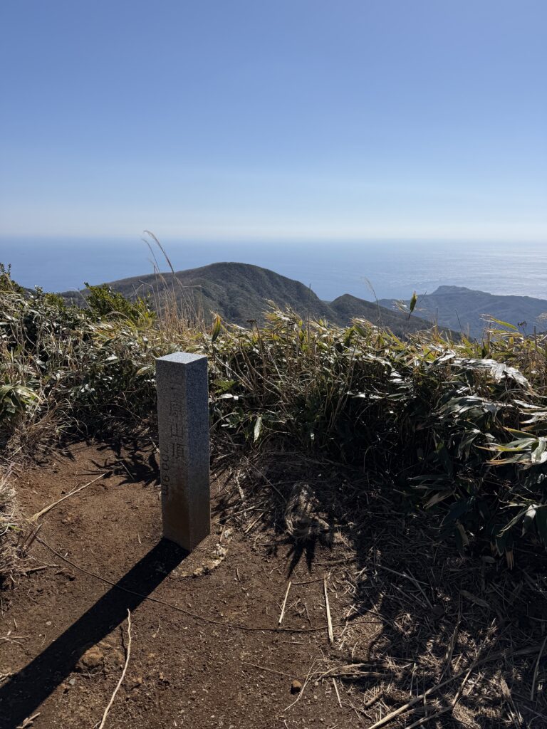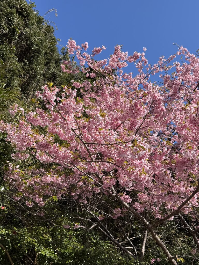 河津桜は満開です。稜線からは昨日登った八丈富士が絶景の景色を望めました。