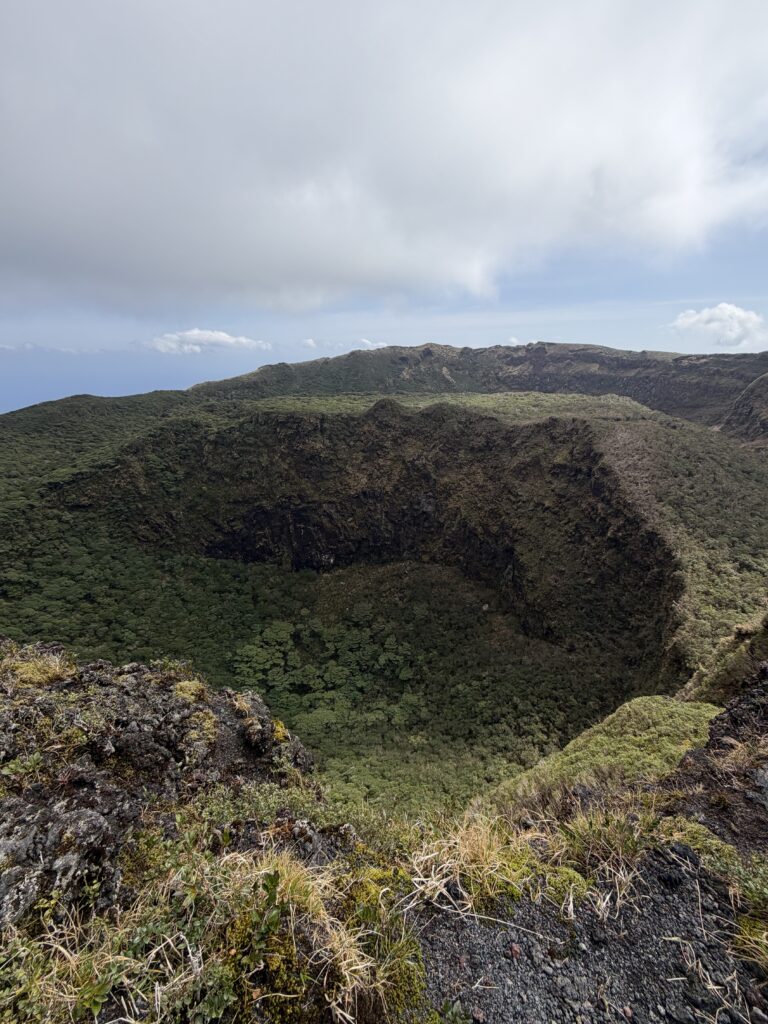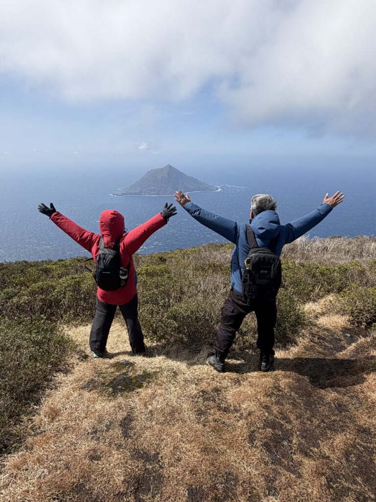 眼下に八丈小島と黒潮の白波を望み、後ろにはお鉢と小穴が覗き込むことが出来ます。